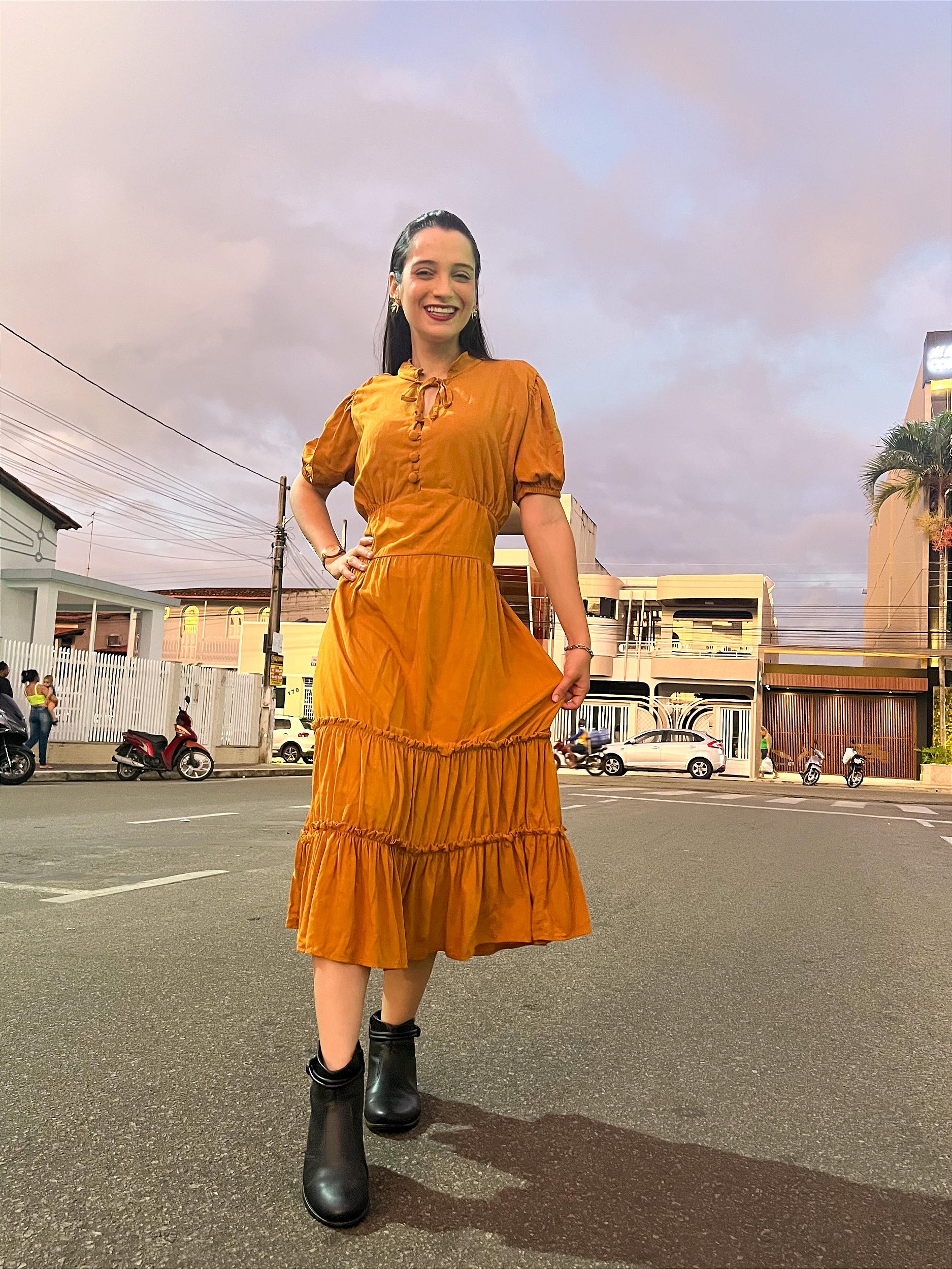 Confeccionado no tecido viscolinho, comprimento midi, botões funcionais e detalhe de amarração no busto.