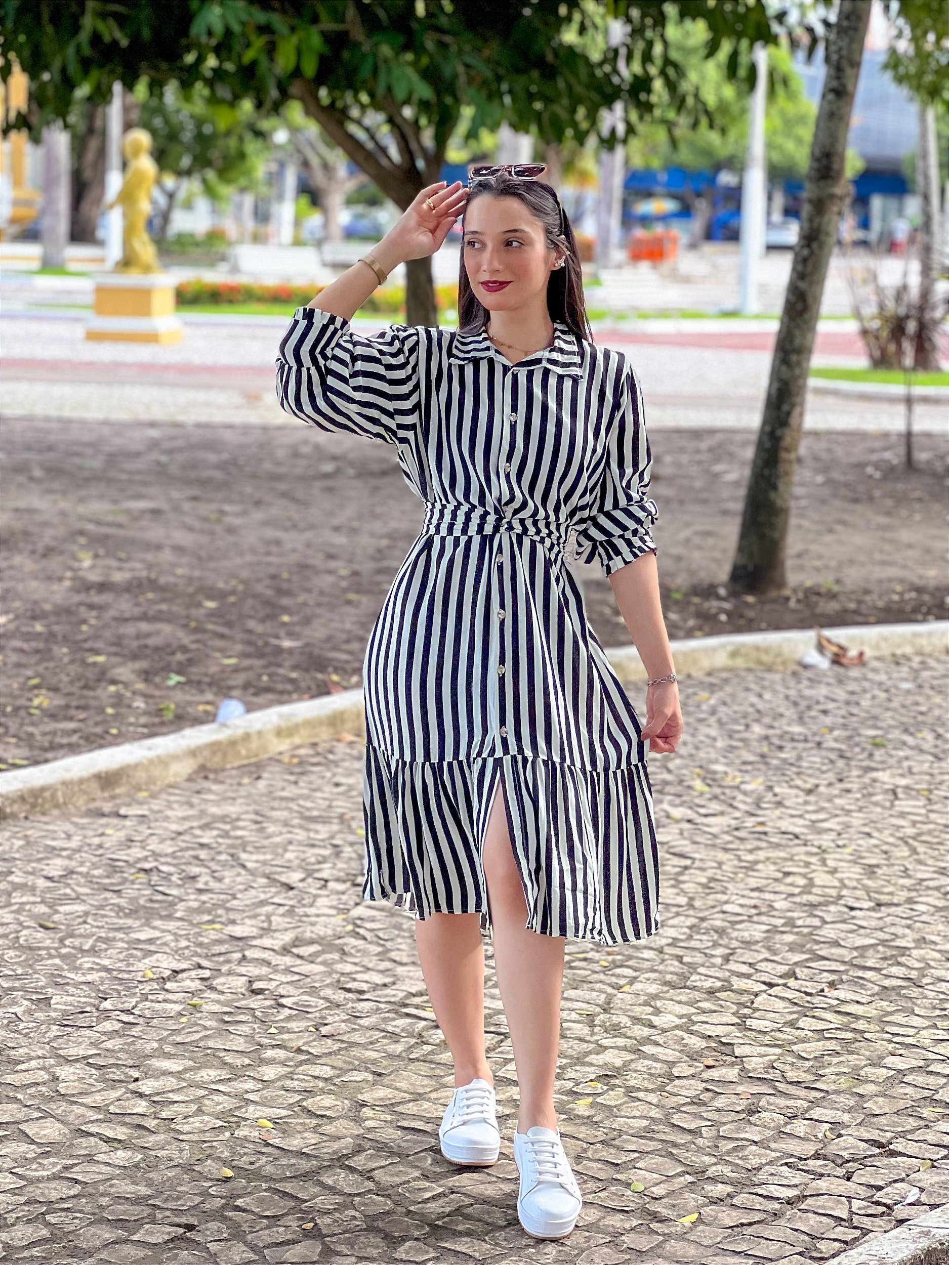 Confeccionado no tecido viscolinho, em comprimento midi, possui botões funcionais e acompanha faixa no mesmo tecido.