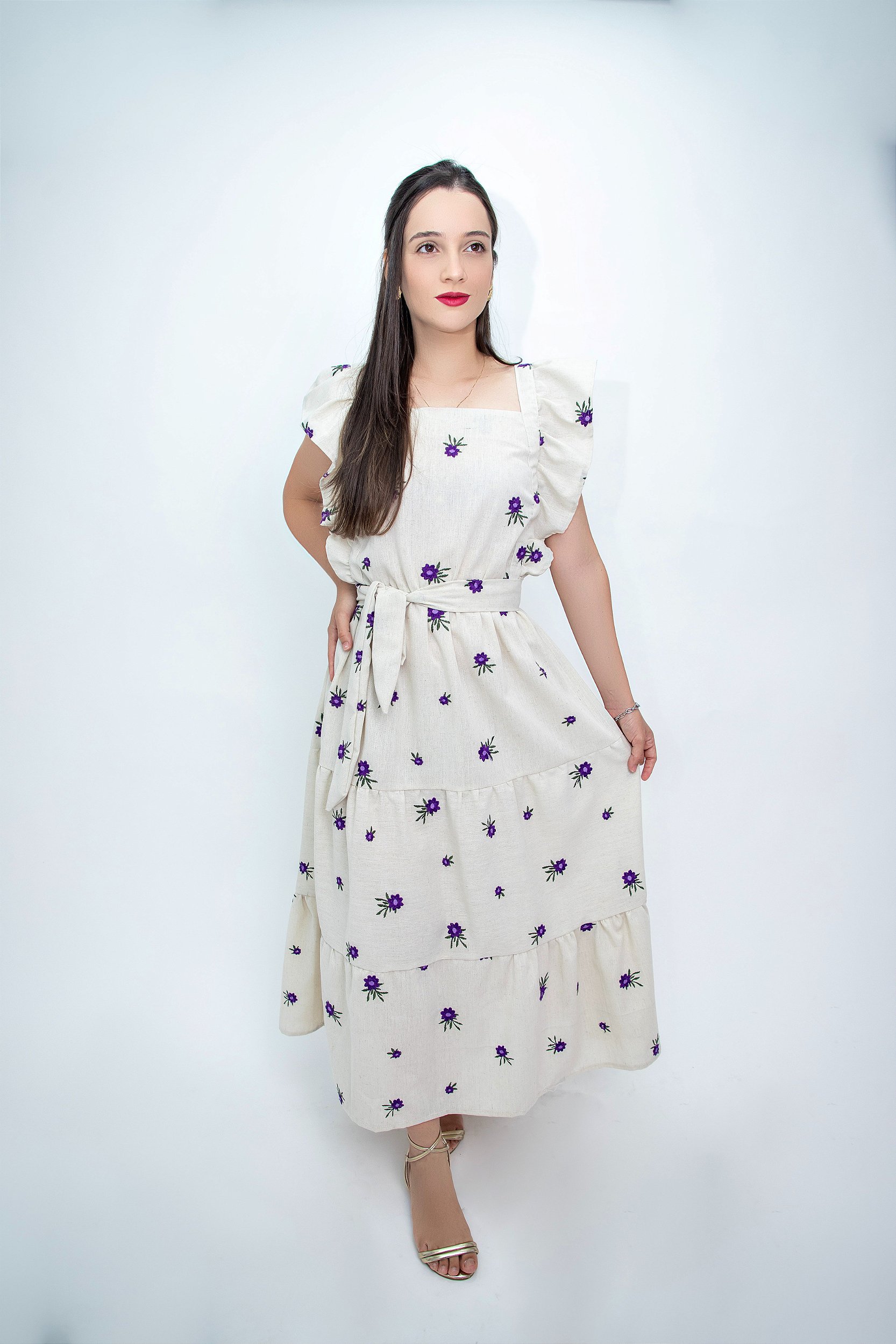 Confeccionado no tecido linho com detalhes de flores bordadas , comprimento midi/longuete, decote quadrado, detalhes de babados no busto. Super fresquinho e veste super bem!